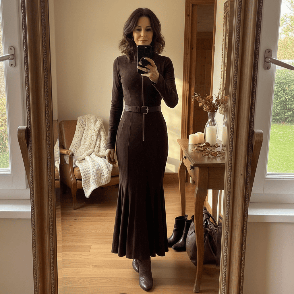 Create a Western-inspired look with cowboy boots and a leather crossbody bag, or elevate for evening with heeled ankle boots and statement jewellery. Layer with a wool coat or sheepskin jacket for sophisticated autumn and winter styling. This dress transitions seamlessly from daytime elegance to evening glamour.
